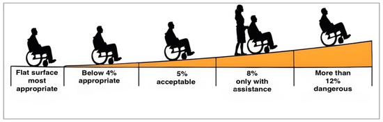 For a high level of accessibility, the weaknesses in the ten routes must be considered and improved. The slope criterion evaluations in Table 4 reveal a common denominator among the routes, with most slopes receiving ratings ranging from very low to medium. The slope criterion is considered the least evaluated compared to other criteria, and there is an urgent need to improve it based on survey responses and route evaluations. R5 rates the best route at 3.79%, while R8 rates the worst route at 8.16%, which is considered highly steep. ADA requirements stipulate that the slope of footpaths must not exceed 5% to provide easy movement without excessive effort so as not to cause fatigue and reduce dependability. Figure 12 illustrates the five cases of slopes identified [58]. The first case, which is absolutely the best, is for the footpath’s surface to be flat. The second case, where the slope is less than 4%, is suitable and manageable for mobility. In the third scenario, a slope of 5% is deemed acceptable. However, if the slope reaches 8%, individuals with disabilities will require assistance to overcome it, and the most dangerous scenario is if it exceeds 12%.