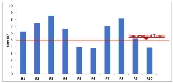 The improvement target for this criterion is for all routes to be at an acceptable and best level so that the slopes are 5% or less, as shown in Figure 13, where it appears that there are only three routes at the required level below the improvement target limit, which are R5, R6, and R10, and others that exceed the improvement target limit need improvement.