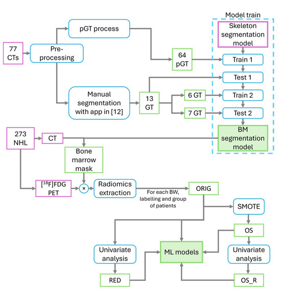 Pipeline of the followed methodology. pGT: pseudo ground truth; GT: ground truth; BM: bone marrow, BW: bin width; ORIG: original; RED: reduced; OS: oversampled; OS_R: oversampled and reduced; ML: machine learning.