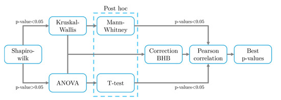 Subsequently, in the original database, the univariate analysis shown in Figure 3 is performed. First of all, a normality test by means of the Shapiro–Wilk method is applied. Those features with a non-normal distribution, i.e., p-value in Shapiro-Wilk test < 0.05, are studied by means of the Kruskal–Wallis test to evaluate significant differences between the three possible statuses (BMI−, BMI+, and rBM). If the feature results in statistically significant differences between groups with the Kruskal–Wallis test or the ANOVA test, then a post hoc test based on the Mann–Whitney U test or T-test, respectively, is applied in order to study if the statistically significant difference observed is between the three groups or only two of them. Simultaneously to the post hoc tests, a correction by means of the Benjamini–Hochberg (BH) test is applied to the p-values obtained for the Kruskal–Wallis and ANOVA tests. All features with statistically significant differences are included in the Pearson correlation analysis, while the rest are removed from the database. Using Pearson’s correlation, one variable is removed for each pair with a correlation greater than 0.9, removing the feature with the lower p-value in the difference analysis. Finally, those remaining with higher p-values in the Kruskal–Wallis and ANOVA analyses are eliminated until the number of variables is equal to 10% of the number of cases (1 characteristic for every 10 subjects). A p-value of <0.05 is considered statistically significant in all analyses.