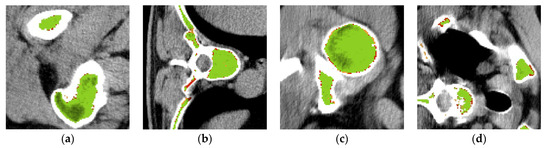 Since the first part of the training is based on a model previously developed in [22] and pseudo bone marrow masks, only the parameter order can be evaluated. From the twenty orders, the best of them obtains a performance characterized by a Dice Index of 0.94 and IoU of 0.892. After training this model with the six manually segmented cases, i.e., a real ground truth, the performance improves in values of these same indexes of 0.964 and 0.933. As can be seen in Figure 4, the vast majority of segmented pixels are correctly assigned as bone marrow masks (green). Concretely, in Figure 5, the slices from Figure 4 are magnified to observe the mistaken pixels. Only some regions are complete or partially misleading, while many pixels belong to misunderstood edges.
