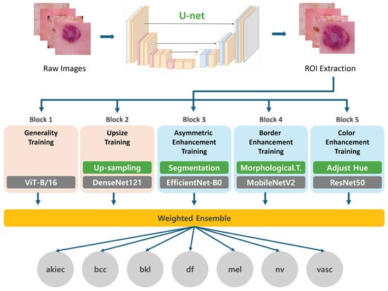 Figure 4 illustrates the overall architecture of our model. First, the ROI of the lesion is extracted from the original image using U-Net by generating a segmentation mask. The details are described in Section 3.3. Next, five different classifiers are trained: two for general classification tasks (Block 1: Generality Training and Block 2: Upsize Training), and three classifiers specifically tailored to the ABCD rule (Block 3: Asymmetry Enhancement Training, Block 4: Border Enhancement Training, and Block 5: Color Enhancement Training). Finally, a weighted ensemble of the five trained classifiers is performed to classify the skin lesions. The details on each of the five classifiers are provided in Section 3.4.