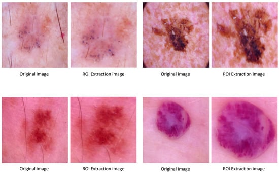 Four different images applying ROI extraction. The image on the left is the original image, and the image on the right is a sample image with ROI extraction applied.