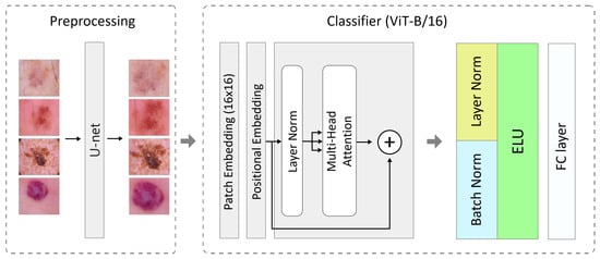 Generality Training (Block 1): The Generality Training block represents the most basic model, which does not consider the ABCD rule. Since no specific techniques related to the ABCD rule are applied, this model learns the overall characteristics of the data in terms of general image features. The detailed structure of the model is described in Figure 6. The classifier for the Generality Training block is Vision Transformer-B/16 (ViT-B/16) [21]. The ViT model vectorizes an image of size by cutting it into N patches of size and flattening them into N vectors of dimension . It is a model that extracts features with a transformer encoder consisting of multi-head self-attention and proceeds with classification through a fully connected layer. We also tune the parameters of the Transformer encoder to achieve high performance on the relatively small-sized HAM10000 dataset.