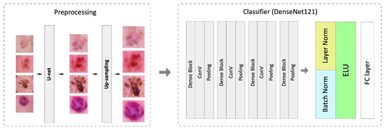 Upsize Training (Block 2): In Upsize Training, unlike the others, a image is generated through preprocessing and fed into a classifier. The detailed structure of the model is described in Figure 7. By utilizing a larger image size than other inputs, the model can capture finer details and more intricate patterns in the skin lesions, improving feature extraction and learning richer spatial relationships. This allows the model to potentially enhance its performance in detecting subtle irregularities, which may be missed with smaller images. The classifier of the Upsize Training adopts the DenseNet121 model. The DenseNet121 model is a deep learning model developed by connecting feature maps of all layers. In the case of the existing ResNet model, to solve the loss of information between layers, a feature map was added, but in the case of DenseNet, the feature maps are concatenated and the output of the previous layer is used as the input again to extract the result through the Dense block [14].