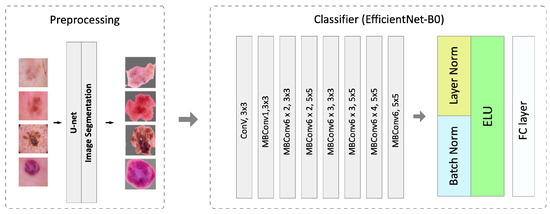 The classifier for Asymmetry Enhancement Training uses the EfficientNet-B0 model, pre-trained on ImageNet. EfficientNet-B0 is built by stacking MBConv blocks [16], which are optimized using the squeeze-and-excitation method to improve performance by recalculating the weight between channels [46]. Among the EfficientNet family, EfficientNet-B0 is the model with the smallest number of parameters, and it is defined by a width-coefficient of 1.0 and a depth-coefficient of 1.0.
