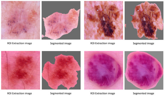 Asymmetry Enhancement Training (Block 3): In Asymmetry Enhancement Training, segmentation is performed to allow the model to focus on asymmetry in the lesion, highlighting the shape of the lesion. As shown in Figure 8, a segmented image generates a segmentation mask of an image using the U-net model for ROI extraction in the preprocessing step. In the generated segmentation mask, as expressed in Equation (4), the segmentation mask part is dot-produced for the original image, and only the part with the segmentation mask of 1 is derived and preprocessed into a segmented image. Through this process, the model can more accurately capture its symmetry, since we can identify the lesion’s shape clearly, as shown in Figure 9.