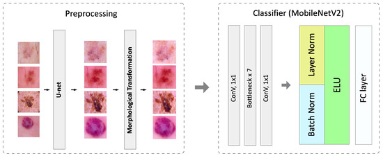 Recently, various automation methods have been developed to classify skin cancer using skin images. Most of the previous studies have focused on developing various artificial intelligence algorithms to automate the diagnosis of different types of skin cancer, and studies on the detection, segmentation, and classification of skin lesions associated with skin cancer have been conducted using the CNN-based architecture. He et al. [12] presented a ResNet model that solved the problem of losing gradients as the depth of the existing CNN model became deeper using a residual block. Alwakid et al. [13] used CNN models and modified ResNet50, applying them to the HAM10000 dataset. They improved image quality using ESRGAN and addressed the class imbalance problem using data augmentation. They obtained results with 86% and 85.3% accuracy using CNN and ResNet50 models. Huang et al. [14] presented DenseNet in 2017, a deep learning model in which each layer receives inputs from all previous layers to optimize information flow and gradient delivery, and prevents overfitting by reusing characteristics with high parameter efficiency. Howard et al. [15] presented MobileNet in 2017, a lightweight network model for learning in resource-constrained situations. Using depthwise separable convolution operations instead of standard CNN convolutions helped to reduce the number of training parameters. In 2019, Tan et al. [16] presented an EfficientNet that can achieve higher performance with fewer operations than other models using a complex scaling method that simultaneously scales the width, depth, and resolution of the model. In 2022, Ali et al. [17] trained EfficientNet B0-B7 on the HAM10000 dataset by performing transfer learning on pre-trained ImageNet weights and fine-tuning the convolutional neural networks. The best model in this paper, EfficientNet B4, achieved a Top-1 accuracy of 87.91%. Also in 2022, Yin et al. [18] added the MD-Net module to the DenseNet model for the ISIC 2019 dataset, achieving accuracies of 83.5%, 84.1%, and 83.8% for DenseNet121, DenseNet169, and DenseNet201. In 2023, Wang et al. [19] performed a skin cancer classification task by extending the dataset and DMN using CycleGaN. Furthermore, to alleviate the gradient vanishing problem, he proposed a DMN to add connections and branches to the MobileNetV2 classification network, achieving an accuracy of 87.07%, which is higher than the 82.58% accuracy of the basic MobileNetV2 model.