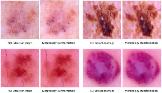Border Enhancement Training (Block 4): Border Enhancement Training involves blurring the overall color of an image so that the model does not rely on color features, allowing it to focus more on the edges instead. As depicted in Figure 10, Morphological Transformation applies erosion and dilation to the image data by pooling the image data through a kernel-sized filter. We apply a Morphological Transformation using a kernel size of 6, as shown in Equation (5). This process involves performing erosion on the original image using max pooling. Then, it was expanded again using Equation (6) to resemble the original image [47]. As the erosion and dilation progresses, the overall color of the image becomes unclear and blurred as shown in Figure 11, allowing the model to learn by focusing on the shape and border of the lesion part rather than the color feature.