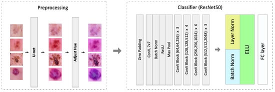 The raw data are subjected to basic preprocessing steps. The raw images in the HAM10000 dataset capture not only the lesion but also the surrounding skin, which often includes noise such as wounds or age spots. To avoid the effect of these noises, we apply a U-net model [44] to extract the Region of Interest (ROI) from the original image, isolating the lesion from the surrounding area.
