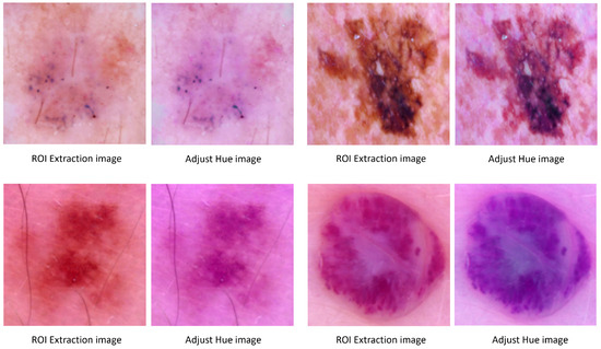 Four different sample applying Adjust Hue. The image on the left shows the original image with ROI extraction applied, while the image on the right displays the same image with Adjust Hue applied after ROI extraction.