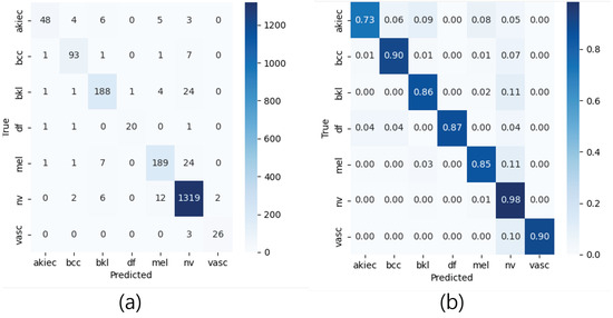 In this research, we classify skin cancer images from the HAM10000 dataset into seven classes, and the model’s classification performance may differ for each class. Accordingly, we visualized the confusion matrix to understand the model’s classification performance for each class on the test dataset, as shown in Figure 14. The y-axis represents the actual classes, while the x-axis indicates the predicted classes by the model. The left confusion matrix (a) shows the raw confusion matrix, displaying the actual counts of correctly and incorrectly classified instances for each class. The diagonal elements represent True Positives (TP), while the off-diagonal elements indicate misclassifications. The right confusion matrix (b) shows the normalized confusion matrix, where the values are represented as percentages, demonstrating the model’s classification performance for each class. This helps in understanding the relative performance of the model across different classes, regardless of the imbalance in the number of samples for each class. As demonstrated in Figure 14b, we can see that the True Positive Rate (TPR) for the ‘nv’ class is the highest at 0.98, followed by the ‘vasc’, ‘bcc’, ‘bkl’, ‘mel’ and ‘akiec’ classes, with a TPR of 0.90, 0.87, 0.86, 0.85 and 0.73, respectively. However, the ’akiec’ class exhibits a relatively lower TPR of 0.73. This suggests that while our ABC ensemble model did not perform as well in learning features for the ‘akiec’ class, it successfully captured the features for the remaining six classes. The issue of insufficient learning for the ‘akiec’ class will be addressed in detail in Section 5.