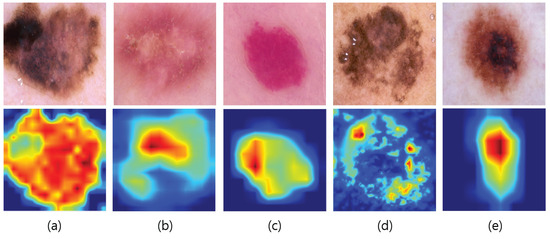 In summary, Grad-CAM allowed us to observe that each of the five different preprocessing methods focuses on different characteristics of the lesion. This suggests that our model’s use of various preprocessing techniques, guided by the ABCD rule, effectively contributed to the improvement in performance.