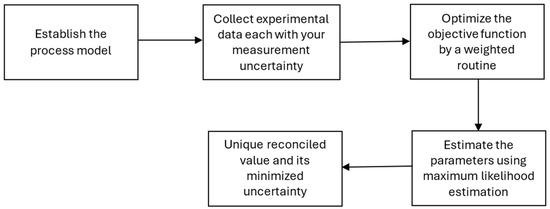 The typical procedure for implementing DR involves the following steps: (i) Definition of the reference model, i.e., a common structure and understanding of a specific system. In this step, it is assumed that the mathematical model is ideal, free from gross or systematic errors, mistakes, or inaccuracies in measurements, and follows a normal distribution. It also assumes independence between the measurements [12]. An objective function, describes it, that is, the disparity between the projected model and empirical data. (ii) The objective function, a mathematical function that measures the performance of a solution in optimization or decision-making problems, is optimized by formulating it as a multivariate Gaussian distribution, considering the experimental variances weighted by the measurement uncertainty. During this step, the goal is to minimize or maximize the probability of obtaining experimental measurements within the defined criteria. (iii) Evaluate the parameters [13] by maximum likelihood estimation (MLE), a statistical method used to find the best values for the parameters of a model. See Figure 1.