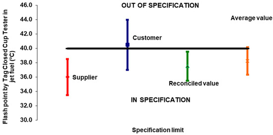 Reconciled value: From Equations (17) and (19), applying the DR technique, it is noticed that the flash point measured by Tag Closed Cup Tester is clearly beyond the specified limits; thus, the reconciled value, = 37.5 °C, and its minimized uncertainty, = 2.0 °C, that is, 35.5 °C to 39.5 °C, fall below the allowable maximum limit, which is 40.0 °C.
