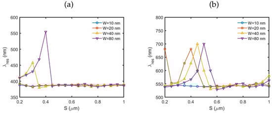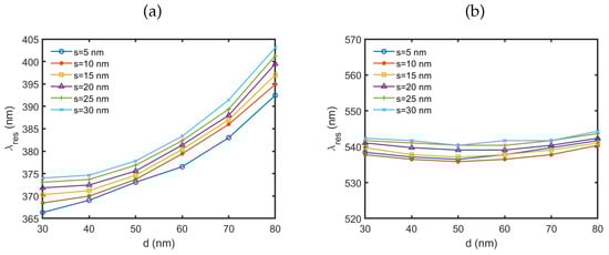 Figure 13 displays the plasmonic resonance wavelengths when the NPs were incorporated into the CR setup. These results illustrate the impact of NP–CR plasmonic interactions on the Purcell factor. Note that the distances between the feeder NP and the corner apex are unnormalized in these plots. The results obtained for spherical NPs, shown in