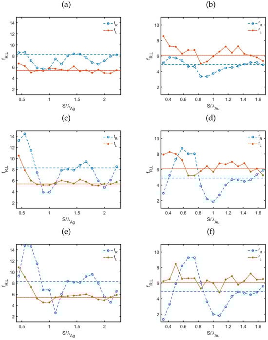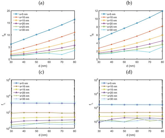The calculated values of the radiative transition factor, , at the target wavelengths generally increased as the particle size grew and the distance between the emitter and the NP diminished, both for silver and gold NPs. However, the variation in terms of with particle size d at resonance differed between silver and gold. For gold NPs, the trend for at resonance was similar to that observed at , while for silver NPs, exhibited a local maximum at a specific d when the separation s was small. In general, reached higher values for silver NPs than for gold, both at resonance and at the target wavelength. Although the relative size of the NPs compared to the wavelength at which was measured was larger for silver NPs, the ratio of the relative sizes was smaller than the observed ratios of values. On the other hand, when the value of the wavelength was taken in consideration, the corresponding relative distances between the source and the NP were larger for silver NPs.