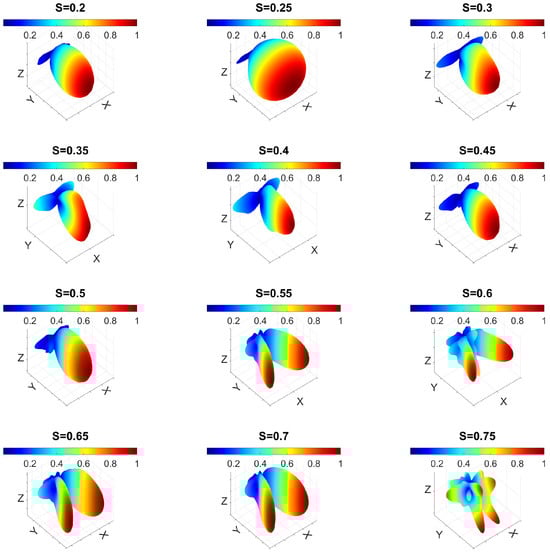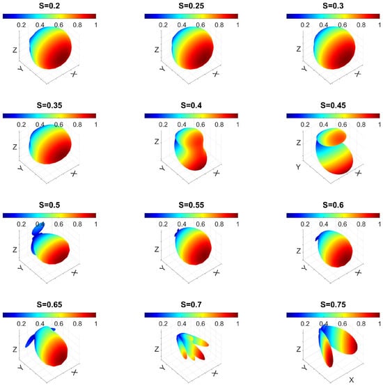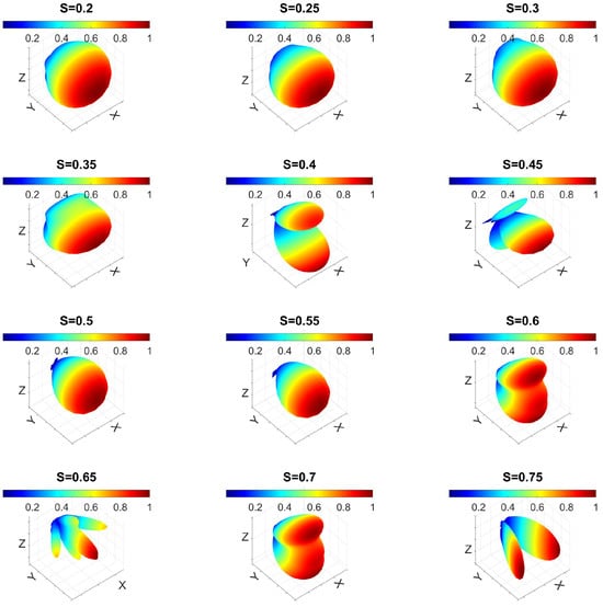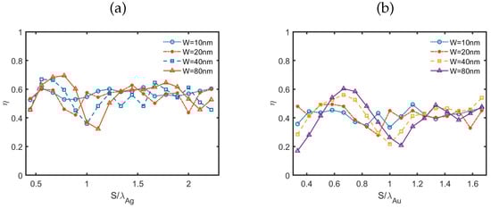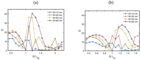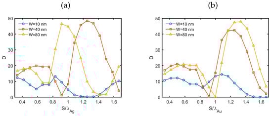 In the case of gold, the relative positions of the maxima and minima as a function of closely matched those found for m, with a null occurring at for nm. In contrast, for silver, significant shifts in the directivity maxima and minima as a function of were observed, and these shifts were highly dependent on the value of W.