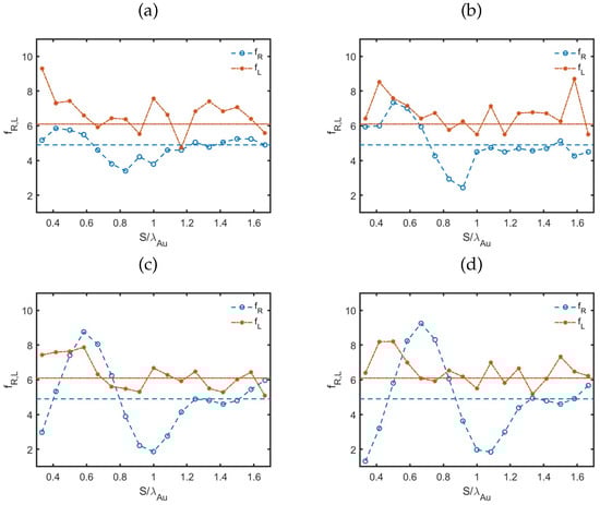 For the gold CRs, the first maximum provided a high directivity and an improvement in the value. At the second maximum, while the directivity was even greater, the was close to the reference value. In both cases, the losses were similar to those of the gold NP without the CR. The gain figure of merit values were and for the first and second maxima, respectively, significantly exceeding the value of obtained for the NA without the CR but significantly in value lower than the values obtained for silver CR NAs. In addition to the impact of the better figures for the and values in the case of silver NAs, the lower values of G obtained in the case of gold CR NAs were also due to the fact that was smaller in the case of gold.