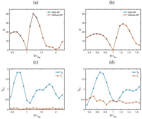 Regarding photon loss due to absorption at the NP, the value of increased significantly as the distance between the dipole emitter and the NP decreased. Conversely, the NP size d showed a lesser effect on . Overall, the loss factors for silver NPs were smaller, though still comparable, to those for gold NPs.