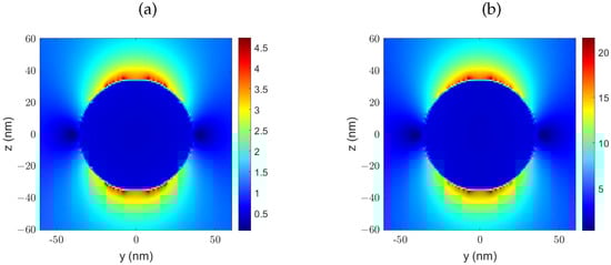 The numerical calculations were conducted using ANSYS Lumerical FDTD Solutions, release 2024 R2.1, on a HP Z6 G4 Workstation with two Intel Xeon 6226R processors and 512 GB of RAM. For the FDTD simulations, a variable-size discretization was employed, with a finer grid in the dipole-nanoparticle region. The discretization parameters were adjusted based on a series of convergence analyses, setting the maximum grid step to nm within this region. To reduce computational costs, the symmetry planes and were utilized for the feeder system, and symmetry was exploited in simulations, including the CR. In principle, exploiting the symmetry of the problem when specifying the boundary conditions should not affect the accuracy of the obtained solutions, which should remain consistent with the symmetry considerations, regardless of the boundary conditions used. Nevertheless, several test computations were carried out without the symmetry boundary conditions, and no significant differences were observed in the results. The dipole source emitted a short pulse covering the spectral region between 300 and 800 nm. The total duration of the simulations was set to fs. The analyses focused on a target wavelength nm for silver and nm for gold. The wavelength of interest in any application will depend on the specific fluorophore being used. To ensure a fair comparison between the two metals, which have different plasmonic resonance wavelengths, the target wavelengths for the silver and gold NAs were arbitrarily selected to be redshifted from their respective resonances by similar spectral separations, typical of those found in applications.
