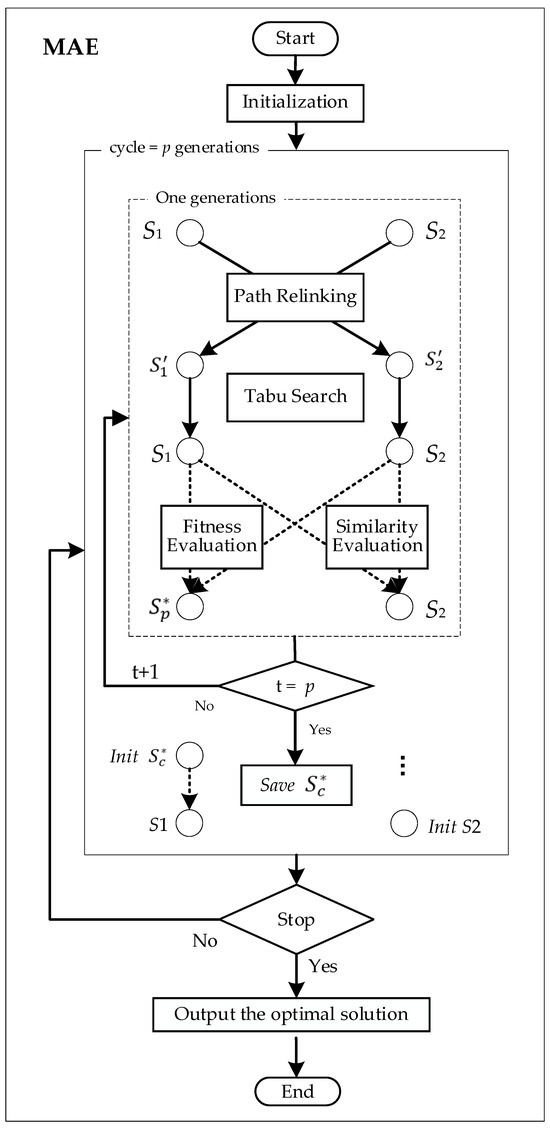 As shown in Figure 3, the MAE algorithm consists of three main operators: an initialization function for generating random solutions, a tabu search (TS) operator for improving solution performance, and a path relinking (PR) operator for updating offspring. The MAE algorithm consists of several loops, each with iterations. The algorithm first generates two random solutions, and . During each generation of iterations, two offspring solutions, and , are created by performing PR operations on and . The solutions and then undergo TS operations to become the new individuals and . If either the new or outperforms the current optimal individual in that iteration, is updated. At the end of each loop, is updated to the best solution from the previous loop, while is updated to the current optimal solution , and is re-initialized. Throughout the iterations, if is close to in terms of distance, is replaced with a new random solution to ensure diversity in the search process. The optimal solution from the last iteration is returned as the final optimized solution.