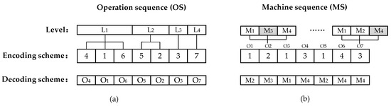 In the design of machine sequence encoding, we traverse each operation in natural order. If an operation has candidate machines, an integer is randomly selected from the range to serve as the index of the machine designated for that operation. The corresponding values for each operation are then arranged in the natural order of the operations, resulting in a comprehensive machine sequence encoding. In the MS encoding illustrated in Figure 4, operation O2 has three candidate machines: M1, M3, and M4. The encoding “2” indicates that O2 is processed on the second candidate machine, which is M3. By applying this method, the machine sequence encoding for all operations can be systematically obtained.