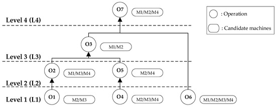 Without loss of generality, we illustrate the encoding framework using product A, as referenced in Figure 1. The assembly levels of the components are first established based on the product’s assembly structure, as depicted in Figure 5. If a component has no preceding components, its assembly level is assigned a value of 1. Conversely, if a component has preceding components, the one with the highest level among them is denoted as . The updated level of becomes , where has a level of . After assigning levels to all components, the components are grouped according to their levels, and the operations associated with these components are shuffled within each group. Finally, the disordered operations from each group are concatenated in ascending order of their levels to form a complete operation sequence. In the OS encoding illustrated in Figure 4, the top three operations (1, 4, and 6) all possess a level of 1, while the subsequent operations (2 and 5) have a level of 2, operation 3 has a level of 3, and operation 7 has a level of 4. There are no sequential constraints among operations at the same level; however, operations at a lower level cannot be processed before those at a higher level. This proposed encoding method not only ensures individual diversity but also effectively prevents the generation of infeasible solutions.