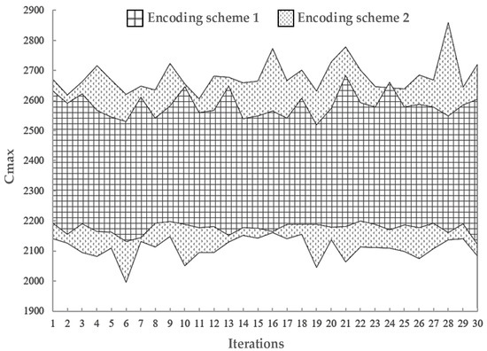 To validate the effectiveness of the two encoding schemes developed in this paper, we applied both schemes to encode and initialize the test case provided by Shi et al. [13]. Each encoding scheme was executed independently for 30 iterations, generating 300 encodings per iteration, and recording the minimum and maximum values of across all encodings. According to the experimental results, the distribution ranges of the initial individuals generated by the two encoding schemes are shown in Figure 8.