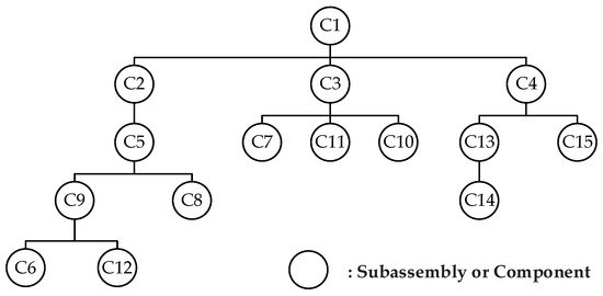 This section will validate and analyze the proposed model and algorithm using Case MK05 as an illustrative example. Case MK05A comprises a total of 15 subassemblies and components. Figure 9 illustrates the assembly relationships among the components, while Table 7 presents the operations associated with each component. Given the overall large scale of the cases considered in this study, the specific available machines and processing times for each operation are not detailed.