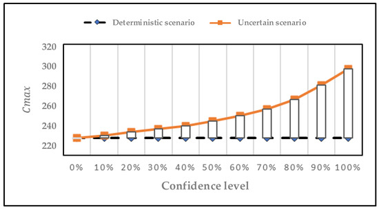 Furthermore, using Case Mk05A as an example, this study validates the impact of processing time uncertainty on the performance of schedules. Figure 10 illustrates the variation of as the confidence level of processing time ranges from 0% to 100%.