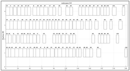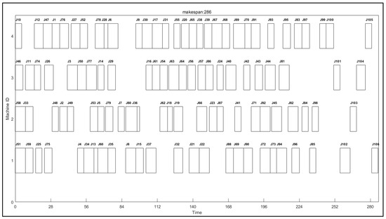 In Figure 10, the dashed line represents the optimal solution when the processing time is fixed at a certain value, while the solid line indicates the trend of , as the confidence level of processing time varies from 0% to 100%. As shown in this figure, when the confidence level is 0, the robust optimization model is equivalent to the deterministic model, allowing for a higher probability of constraint violation. As the confidence level increases, the model accounts for a broader range of scenarios related to processing time uncertainty, necessitating a higher value of to compensate for performance deviations caused by fluctuations in processing time, thereby ensuring that constraints are satisfied. In extreme cases, when the confidence level is equal to 100%, it means that the model considers all possible uncertainty scenarios related to the fluctuations in processing times. Given that the experiment assumes that processing times follow a normal distribution with the standard processing time as the mean, the closer the actual processing time is to the standard, the higher its probability of occurrence. According to Equation (13), the process of increasing confidence levels represents a transition from high-probability scenarios to low-probability scenarios [30]. Consequently, during the initial fluctuation phase of confidence levels, the changes in the objective value are relatively gradual. However, as the confidence level continues to rise, more low-probability scenarios are incorporated into the model, leading to a rapid degradation in the objective function value. Based on the solving results from CPLEX, Figure 11 and Figure 12 display the Gantt charts of the optimal solutions under confidence levels of 60% and 90%, respectively. The symbols associated with the operations in these figures denote their respective operation numbers; for instance, J10 corresponds to operation 10. Notably, as the confidence level increases, also rises, indicating that the schedule has become increasingly conservative.