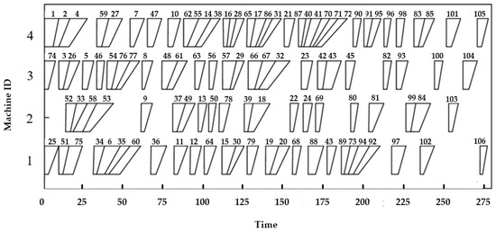 As evidenced by the aforementioned process, interval scheduling differs from deterministic scheduling schemes in that each operation is defined by two interval numbers: its start time and completion time. Therefore, the obtained through interval scheduling is also represented as an interval number. Figure 6 illustrates the Gantt chart corresponding to the encoding scheme presented in Figure 4, where the interval processing times for each operation are as follows: , , , , , , and . In contrast to the conventional Gantt chart representation used in scheduling problems, the interval scheduling Gantt chart illustrated in Figure 6 represents each operation with a trapezoid rather than a rectangle. In this format, the left slanted edge of each trapezoid represents the operation’s start time interval. Specifically, the lower-left vertex indicates the earliest start time, while the upper-left vertex denotes the latest start time. Likewise, the right slanted edge represents the operation’s completion time interval, with the lower-right vertex indicating the earliest completion time and the upper-right vertex indicating the latest completion time. For instance, for operation O7, the start time interval is , and the processing time interval is , resulting in a completion time interval of .