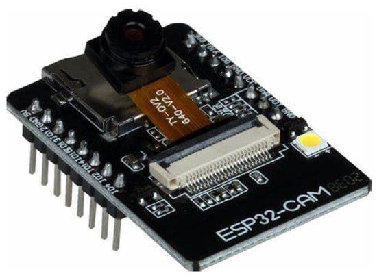 Based on the works of Suto [29,30], the ESP32-CAM platform device was selected. An ESP32-CAM is shown in Figure 1. ESP32 is a System-on-Chip (SoC) developed by Espressif (Shanghai, China), with dual-core 32-bit Tensilica Xtensa LX6 CPU at 240 MHz, with 520 KB SRAM and 8 MB PSRAM. It also has Wi-Fi and BLE wireless connectivity. This SoC is installed in a board, named ESP32-CAM, which is a development board released by AI Thinker Tech (Shenzhen, Guangdong, China). with an ESP32 microcontroller and a standard camera 24-pin DVP connector.