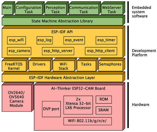 The programming of ESP32-CAM was carried out utilizing ESP–IDF (version 5.1.2), which is the development framework offered by Espressif, the system-on-chip (SoC) manufacturer. This framework, based on C++, provides a hardware abstraction layer and incorporates the FreeRTOS real-time operating system, drivers, and supplementary modules that streamline the development of embedded systems. Figure 3 illustrates the deployment of the most pertinent hardware and software modules within the project. The uppermost layers correspond to the developed code.
