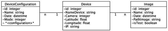 Table 3. Details of endpoints accessible via the Web API. - Data Layer: The Data Layer is responsible for the management and persistence of data within the WebServer architecture. This layer encompasses database systems, repositories, and data storage mechanisms, ensuring the integrity, security, and availability of critical information. At the core of the Data Layer lies a relational database, namely SQL Server, alongside the image repository. The development of the database was undertaken utilizing SQL Server Management Studio (SSMS) and Microsoft SQL Server 2019 Express (SQLEXPRESS). Within the realm of database connectivity and management, ADO.NET Entity Framework is employed to establish the database context, with a specific focus on Entity Framework 7 (EF7). Figure 5 shows the main entities of the database. With regard to the image repository, a two-track approach has been defined, where one track is designated for the storage of test status images (Camera Testing State) and the other for monitoring status images (Monitoring State). Within the database, metadata are recorded for each image, which includes the relevant trap configuration parameters.