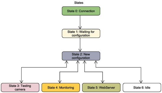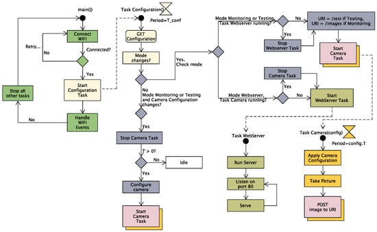 - State: Idle. When device configuration determines it, it remains in a latent state with no image capture and transmission. In this state, the only active task is the Configuration task.