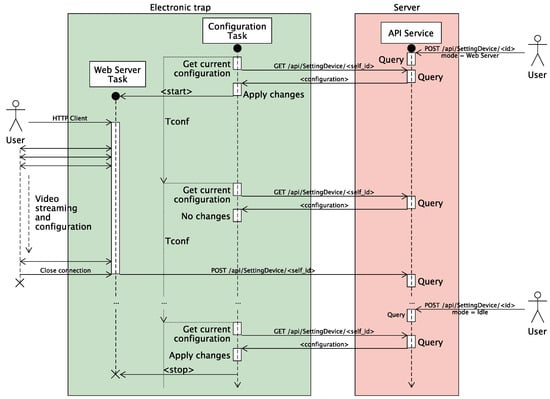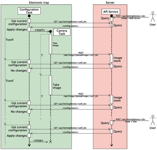 In an electronic trap, the server is where both the configurations of the devices and the repository of captured images are stored for future processing. This service features an API that functions as the interface for both the system user and each electronic trap. The API-based communication between the trap and the server involves periodic retrieval of its current configuration. This retrieval is executed within the Configuration Task every T_conf seconds, where this period is part of the configuration settings. Upon receiving the configuration, if it differs from the current one, the Configuration Task is responsible for implementing it within the system. This involves starting or stopping tasks that are applicable in each specific case, depending on the configuration. Upon device initialization, the interval commencing with the initiation of the Configuration Task and ending with the reception of the initial configuration is occupied by the transient state referred to as Configuration Waiting.