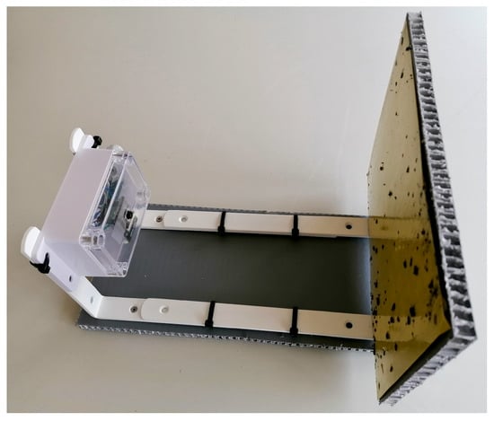 The left side of the image shows the box where the ESP32-CAM board is mounted, with a hole machined in the front to keep the camera lens uncovered, to eliminate distortion of the case material, which initially was chosen to be transparent in order to keep all the electronics inside. A panel parallel to the camera lens, with a sticky surface where insects are trapped, is arranged on the right side. We followed the procedure proposed by Ricolfe-Viala and Esparza [31] for the camera with Autofocus; however, the focal length provided by the manufacturer is inexact and the results are not as precise as expected. Therefore, some manual adjustments on distances of the camera to the trap are required. Thus, the mounting was carried out on two rails that allow the panel to be moved closer or further away from the electronics.
