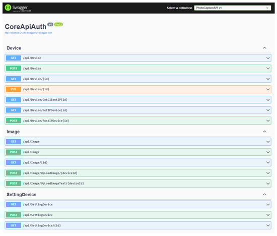 The configuration retrieval is conducted using the GET method at the entry point/api/DeviceSetting/id, where id corresponds to the ID of the device making the query. The modifications to device configurations and the retrieval of images from the repository are also performed by the user via API. In this article, the Swagger user interface has been employed to access the entry points from any web browser.