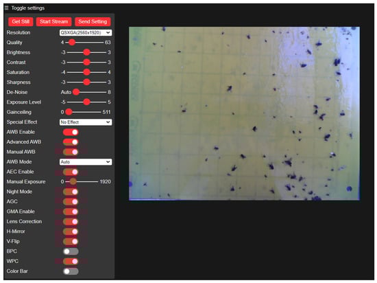 As can be observed from Table 7, the results obtained with the higher resolution camera (OV5640-C) are slightly better than those obtained with the other two cameras, but they are not very far from those obtained with the OV2640 camera (RYS model). Therefore, in order to optimize the volume of data and information transfer, the tests were carried out in a controlled environment with this camera. Figure 14 shows one of the images obtained with this camera.