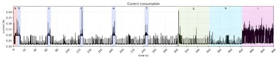During experimentation, an Agilent 34405A laboratory digital multimeter is used along with a Python script, which acquires and stores measurements continuously through the VISA protocol for post-processing. The results obtained are displayed in the temporal graph in Figure 13, where the intervals corresponding to the activities described in Table 5 have been identified. Finally, to facilitate interpretation of the experiment, Table 6 shows the average consumption values for each of the device’s operational modes.