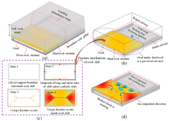 Diagram of gas migration before and after the main roof breakage: (a) suspended plate; (b) before the main roof breakage; (c) rock fracture process; (d) after the main roof breakage.