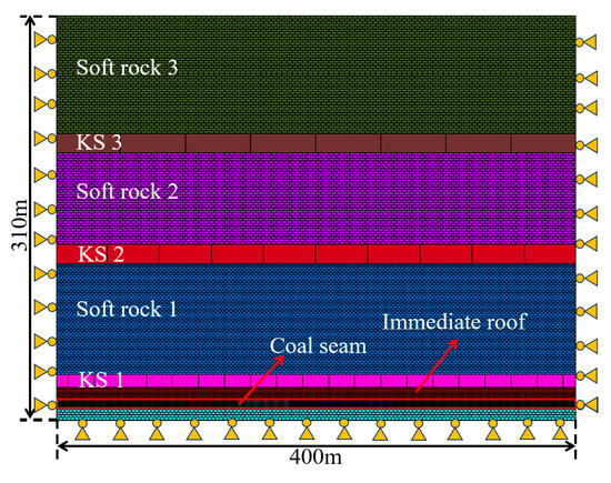 According to the actual conditions of the engineering, a discrete element numerical simulation model with a length of 400 m and a height of 310 m was established by using UDEC 7.0 (Universal Distinct Element Code) numerical simulation software. Table 1 shows the selected parameters for each rock formation, and Figure 2 displays the model schematic. The thickness design of each rock layer was simplified according to the actual distribution of the strata. To avoid the influence of boundary conditions on the simulation effect, a 100 m coal pillar was reserved on both sides of the model. The Mohr–Coulomb constitutive model was used for the contact elements of the model, and the Coulomb slip area contact model was used for the contact model between the blocks.