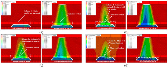 Strata migration diagrams of the 4 schemes when the working face advanced by 80 m and 100 m: (a) Scheme 1; (b) Scheme 2; (c) Scheme 3; (d) Scheme 4.