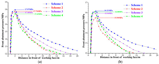 Lead abutment pressure: (a) the working face advanced by 80 m; (b) the working face advanced by 100 m.