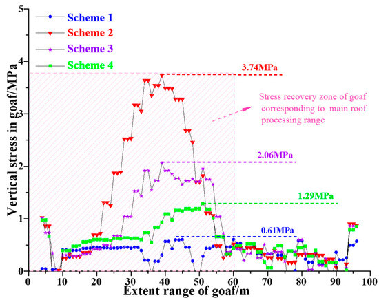 When the main roof was not treated, or fractured in three different schemes, the corresponding peak values of the advanced abutment stress as the working face advanced by 80 m were 17.97 MPa, 17.76 MPa, 17.58 MPa, and 17.43 MPa, respectively. When the working face advanced by 100 m, the corresponding peak values were 16.21 MPa, 15.50 MPa, 15.96 MPa, and 16.08 MPa, respectively, as shown in Figure 4. When the working face advanced by 100 m, the corresponding goaf stress peaks were 0.61 MPa, 3.74 MPa, 2.06 MPa, and 1.29 MPa, respectively, as shown in Figure 5. Compared with the main roof non-fracturing scheme, the fracturing weakening of the main roof alleviated the concentration of the advanced stress concentration of the working face, and the recovery-bearing stress of the goaf increased significantly, among which the advanced abutment stress of the vertical fracturing scheme decreased the most, by 12.73%.