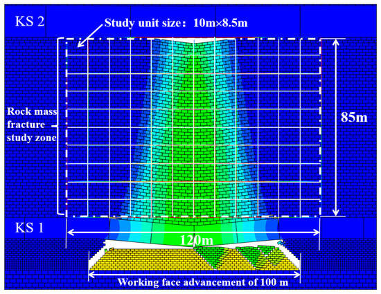 The overlying soft rock is the main layer of the high-level gas drainage roadway, and developing soft rock fissures is conducive to gas extraction. By binarizing the soft rock fracture distribution images extracted from the numerical simulation, the regional soft rock fracture ratio was quantified, and the distribution law of soft rock fractures under different fracturing schemes was studied and compared. It is vital to study the law of fracture generation, development, and closure for the layout of high-level gas drainage roadways and long boreholes and efficient gas extraction. Considering that the thickness of the soft rock above the main roof was 85 m and the first break length of the main roof was 100 m, it was decided to study the distribution of fractures in the 85 m soft rock above the main roof when the working face advanced by 100 m, extending 10 m to both sides of the coal rock mass and advancing 100 m. To facilitate the study and analysis, the study area was divided into a grid with an element size of 10 × 8.5 m2, as shown in Figure 6.
