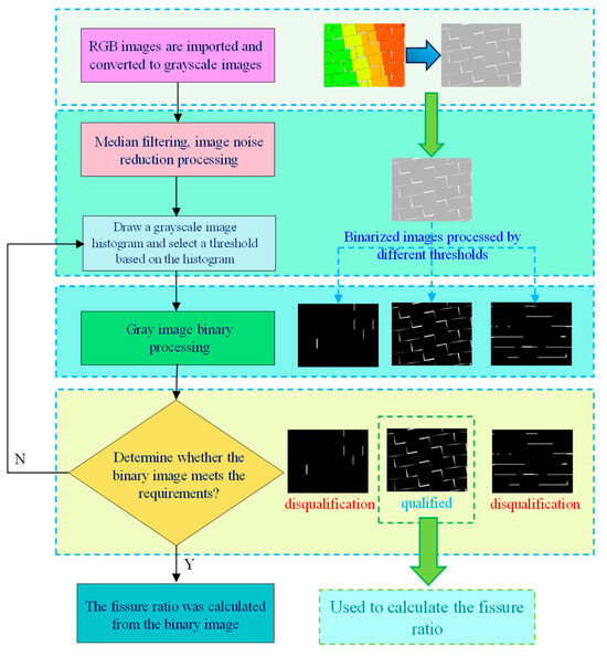 where Φ denotes the fissure ratio; Ai represents the area of a single fracture; Af is the total area of fractures; A refers to the total area of the study area; nw denotes the total number of white pixels, representing the fracture area; and nb is the total number of black pixels, representing the non-fractured area.