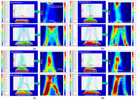 Gas migration pathway in overlying strata when the working face advanced by 80 m and 100 m under different schemes: (a) Scheme 1; (b) Scheme 2; (c) Scheme 3; (d) Scheme 4.
